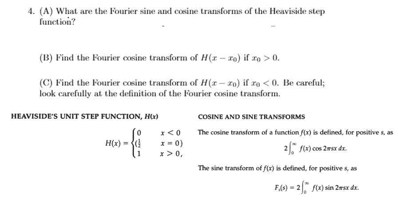 Hi, I am really struggling with the following problem on the Fourier sine and cosine transforms of the Heaviside unit step function. The definitions I have been using are provided below. I tried each part of the problem, but I'm only left in terms of limits as x -> infinity of sin or cos function, which are undefined. How do I approach this? Am I totally off track and missing some key properties of these transforms? Sorry for the poor formatting...any help appreciated.