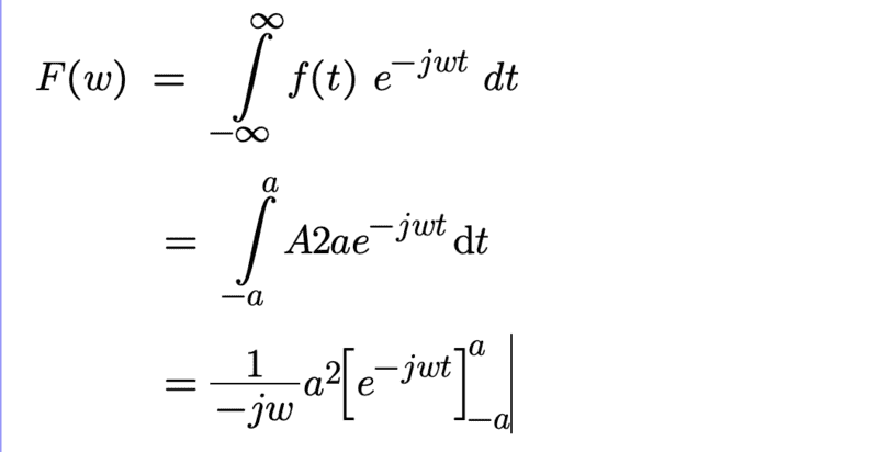- There is a discussion about how the width of the pulse in the time domain (2a) relates to the frequency domain, where it appears to have infinite width.