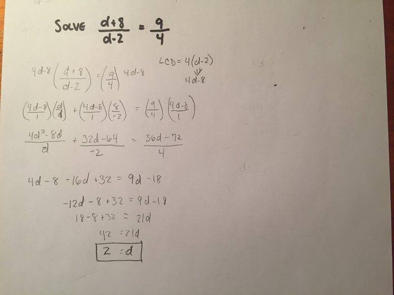 Ive attempted to solve it two ways. The first was to multiply both sides by ##d-2## which gave me the correct answer of ##d=10##.