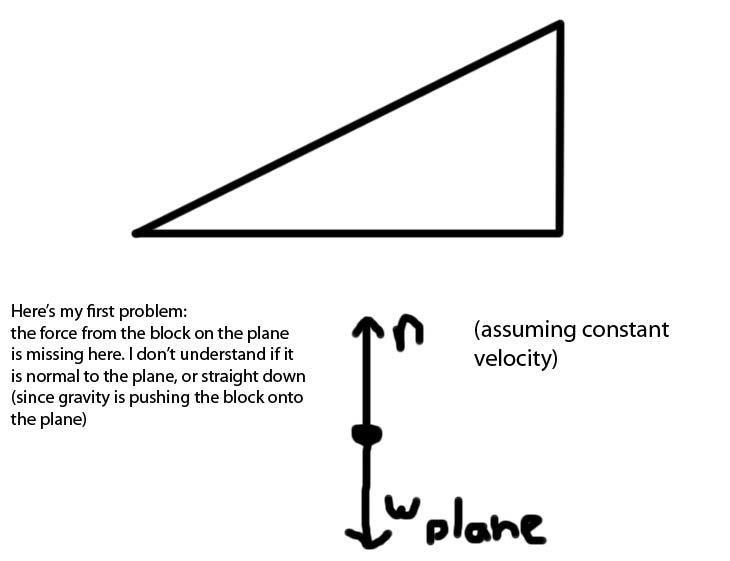 - the weight of the block also acts on the plane, so we have another force acting downwards here.