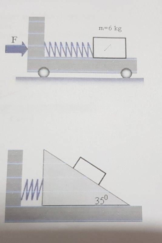 A body ##A## of ##m=9.2 kg## slides down a body ##B## of ##m=17 kg##. ##B## doesn't move because of the force applied by the spring, which suffers a deformation of ##9 cm##. The friction between the two bodies is negligible. Draw the free body diagrams, determine the acceleration of ##A## with respect to ##B## and the elastic constant of the spring.