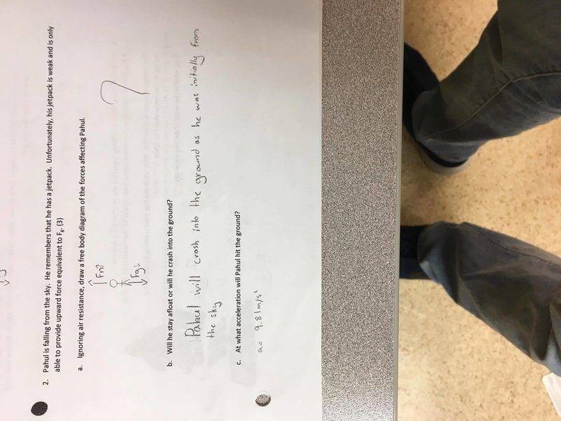 The discussion revolves around a scenario involving a person falling from the sky with a jetpack that provides an upward force equal to the force of gravity. Participants are exploring the implications of this setup on the person's ability to stay afloat or crash to the ground, as well as the acceleration experienced during the fall.