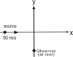 - A source and an observer are situated on two perpendicular tracks as shown in the figure the observer is at rest and source is moving with a speed 50m/s the source emits sound waves of frequency 90Hz which travel in the medium with velocity 200m/s the frequency of sound heard by observer when the source crosses the origin is