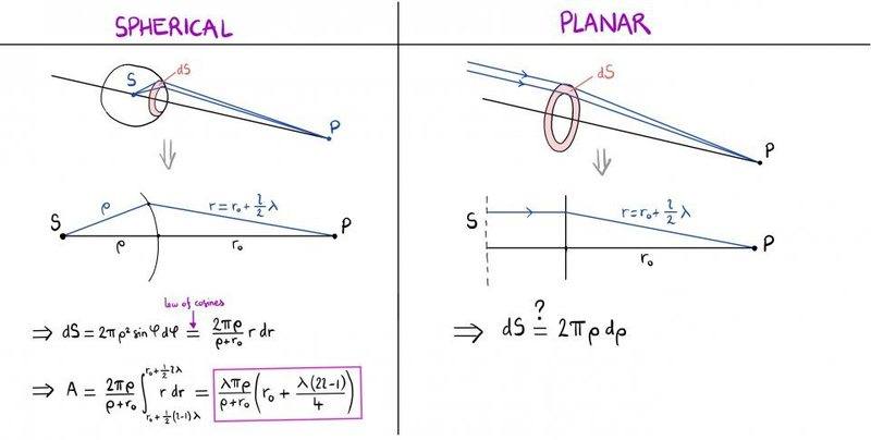 - the ##\pi## element comes from having a "ring" on the sphere. But I think this element also stays since the Fresnel zones are still rings for a planar wavefront (right?);