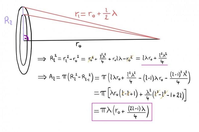 The previous problem mentioned in the hint was about determining the area of the l-th Fresnel zone for a spherical wave. Integration gave me the result ##A_l = \frac{\lambda \pi \rho}{\rho + r_0} \big(r_0 + \frac{(2l - 1) \lambda}{4}\big)## and I concluded that the ratio ##A_l/r_l## is independent of l (where ##r_l## is the average distance to P from the Fresnel zone).