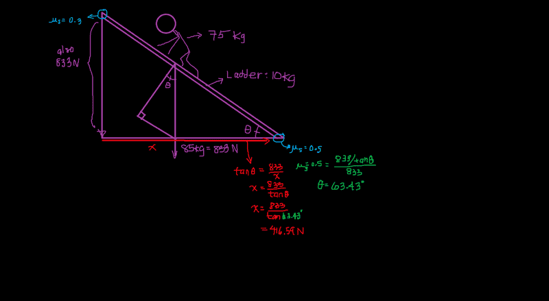 but that is all that is given. i found this here for practice problems http://www.real-world-physics-problems.com/friction-problems.html#hint_for_problem_4PeroK said:You need a better free body diagram, showing the forces at the top and bottom of the ladder.