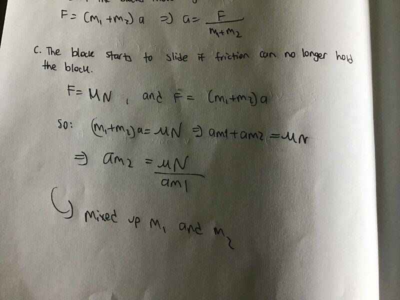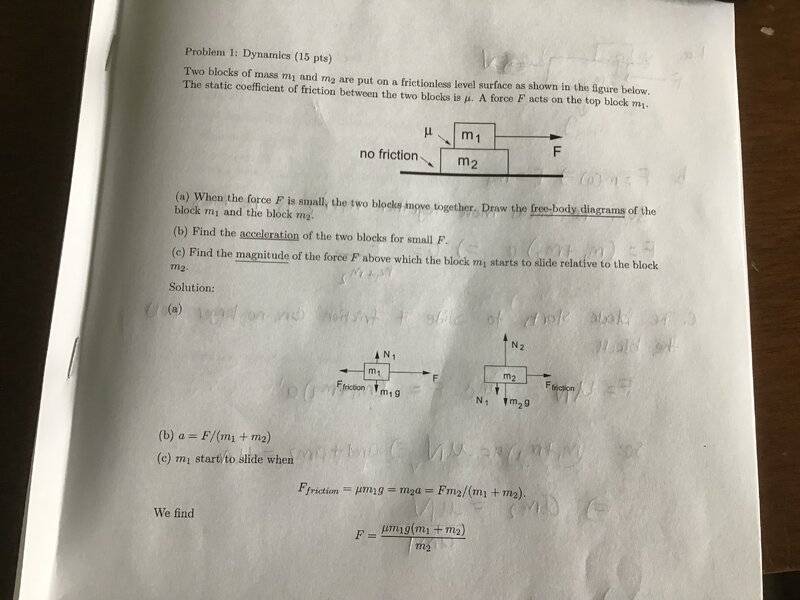 (c) Find the magnitude of the force F above which the block m1 starts to slide relative to the block m1.
