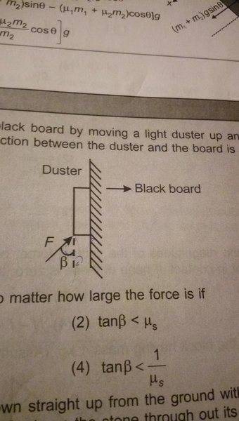 The discussion revolves around a problem involving friction and forces acting on a light duster being moved up and down against a block board. The coefficient of friction is denoted as ##MU##, and the question focuses on the conditions under which the duster will not move regardless of the applied force.