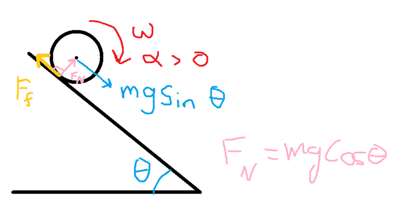 I'm wondering how there's a frictional torque applied to the cylinder, my reasoning is that the object has forward velocity, and on a perfect cylinder, the slope of the incline touches the cylinder at a line parallel to the length of the cylinder, this creates a torque, and the force that creates the torque is less than the kinetic frictional force, so the cylinder does not slide, I'm trying to figure out how this creates a clockwise rotation (why is the direction of the force that creates the torque uphill?), I'm wondering where my logic is correct, and hoping someone can fill in my knowledge gaps, if anyone has a break down of what's happening let me know, thank you!