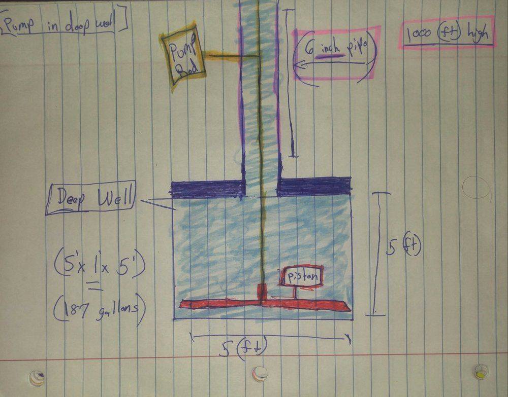 This is a deep well & the dimensions of the bottom chamber is 5x1x5ft which holds 187 gallons. The pump is located in this chamber with a piston/plunger only going up to the top of this chamber at 5ft.