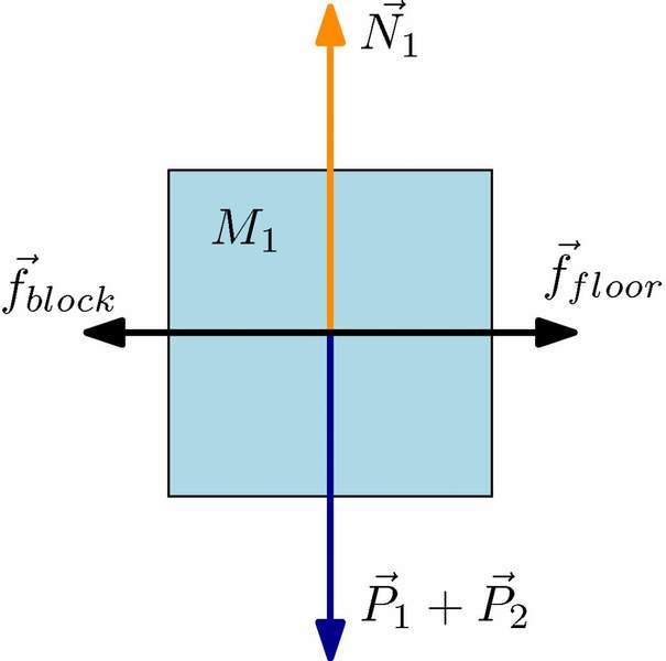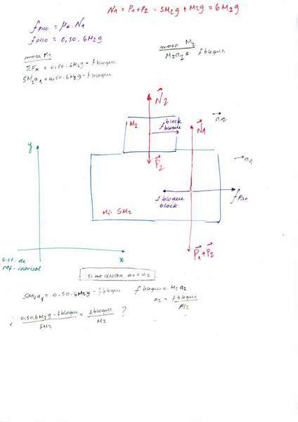 I think the diagram of block 2 is missing a friction force which is caused by m1 as a reaction.. Anyway I do know how to write up the friction force for the floor and big block: