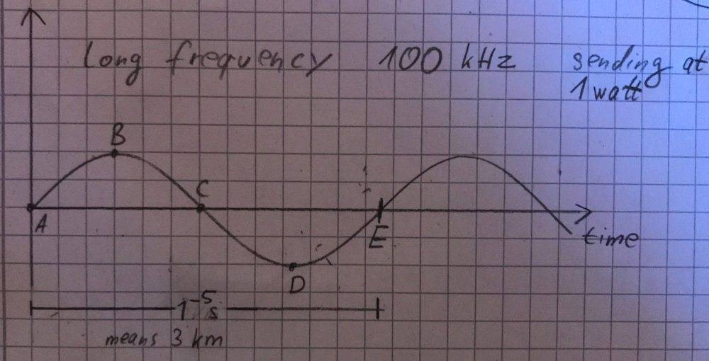 Let's assume the following sine signal sent by a low frequency (100 kHz) transmitter.