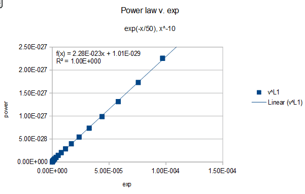 Tried other powers, an x range of 500 to 1000, and observed a general behaviour that ##x^{-n}## v. ##e^{-knx}## is a pretty straight line where k=0.00128 and n ranges from 4 to 12. But if I change the range of x (still over an octave) it breaks down quite fast; probably need k to be a function of a, where the x range is a to 2a.