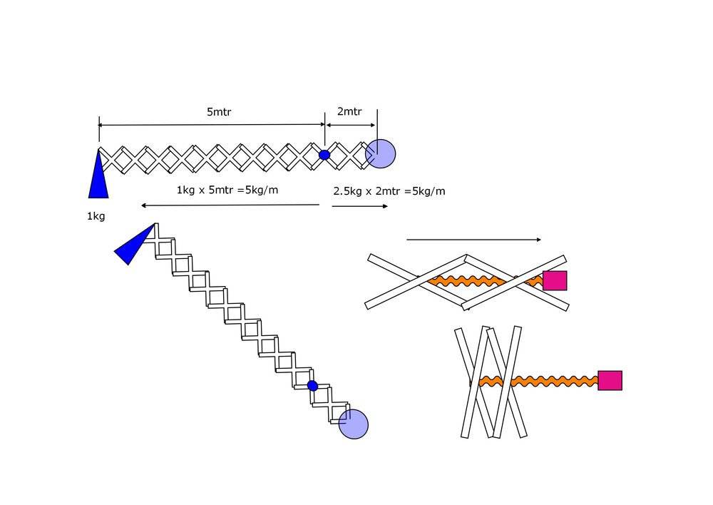 For example, I plan to create a "XXX" scissor / accordian arrangement. The metalwork is in ten "X" sections, each approx 1kg, and extends to 5mtrs. One kg weight on the end. The counterweight side has 1.5 "X" sections. All things equal, that gives a c/w of 3kg ... but doesn't account for the 10kg of beam metalwork. So how to calculate the counterweight required. Any ideas how to proceed?