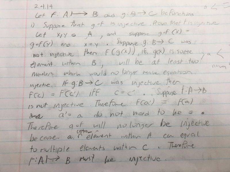 holds in the end (although, I did notice some problems with that, too.) Follow the template! To show f is injective, let a, a' be in A and suppose f(a) = f(a'). Your job is to use the hypotheses to show that a = a'. It should not take more than a few short sentences."