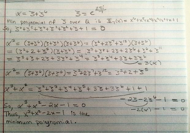 This is what I have done so far. I was wondering if anyone could verify that I found the correct minimum polynomial and roots? If I am incorrect, could someone please help me by explaining how I would find the min polynomial and roots? Thank you.