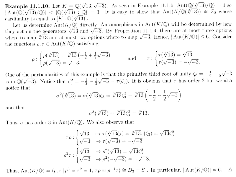 " ... ... By Proposition 11.1.4, there are at most three options where to map ##\sqrt[3]{13}## and at most two options where to map ##\sqrt{ -3 }## ... ... "My question is ... what are the three options where to map ##\sqrt[3]{13}## ... surely there is only one option to map ##\sqrt[3]{13}## as the field extension is over ##\mathbb{Q}## and two of the "options" are imaginary or complex numbers ... or is Lovett just relying on "at most" ... why not rule out the complex roots straight away ... similarly I am puzzled about the two options for ##\sqrt{ -3 }## ... I am also puzzled about the role of Proposition 11.1.4 in this matter ... How does Proposition 11.1.4 ensure that there are at most three options where to map ##\sqrt[3]{13}## and at most two options where to map ##\sqrt{ -3 }## ... ... ... can someone please clarify the situation ...The above question refers to Proposition 11.1.4 ... ... so I am providing the text of that proposition ... ... as follows ... ...