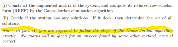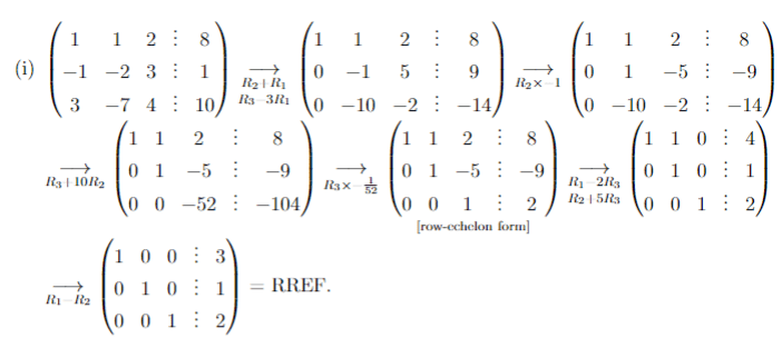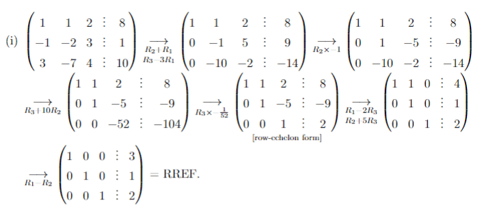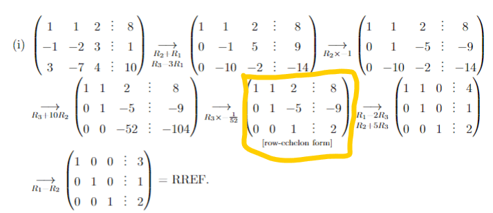 However, I am somewhat confused how to follow the steps of the Gauss-Jordan Elimination algorithm from there. Do I have to eliminate the coefficients from ##x_2## and ##x_3## respectively from row 1 and the -5 coefficient from row 2 in the exact order that they did?