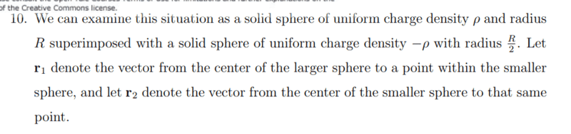 - A solid sphere of radius R has uniform charge density ρ. A hole of radius R/2 is scooped out of it as shown in Figure 10. Show that the field inside the hole is uniform and along the x-axis and of magnitude ρR/6ε0. Hint: Think of the hole as a superposition of positive and negative charges.