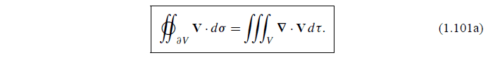 2. What does ##\partial{V}## in Equation (1.101a) stands for? In physics, I realized that ##\partial{V}## is usually not included when Gauss' theorem is used, why is that?