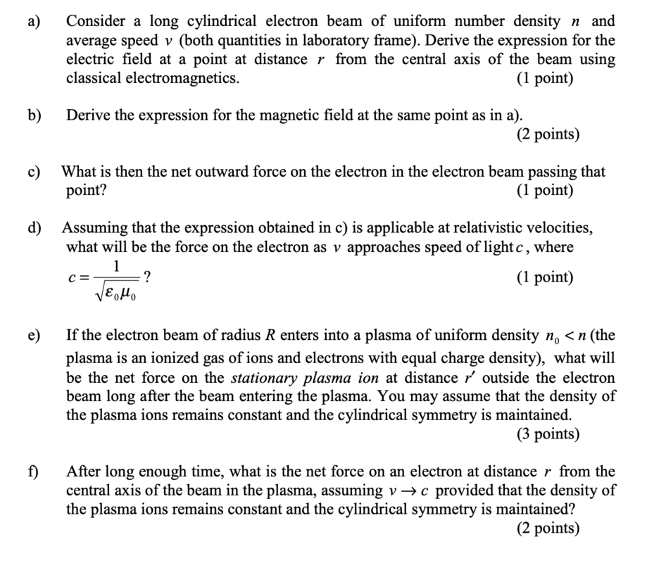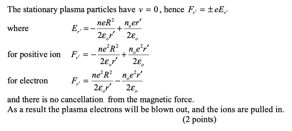 I do not understand the following solution to part e. The term on the left represents the E-field due to the electron beam, which I understand. I suppose the term on the right is the E-field due to the positively charged ions in the plasma. However, isn't the effect of the positively charged ions in the plasma negated by the effect of the negatively charged electrons in the plasma? Thus, the term on the right should not exist. What is wrong?