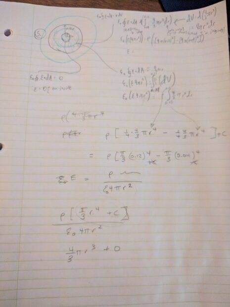 ThrawnGaming said:I tried integrating for 4/3 pi r^3 with r= 0.04 to r=0.12, and I found that the charge decayed exponentially from r=0.04 (1/r^2), but I know that is incorrect, because for volume charge densities, it should increase from r=0.04...