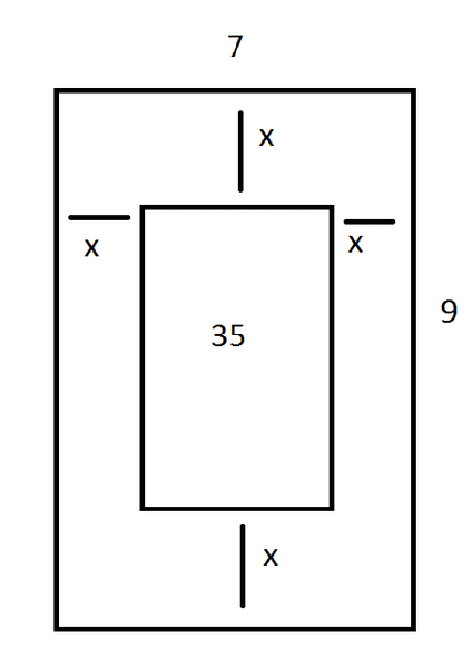 A rectangle with area of 35 cm2 is formed by cutting off strips of equal width from a rectangular piece of paper. The rectangular piece of paper is of 7cm width and 9cm length.