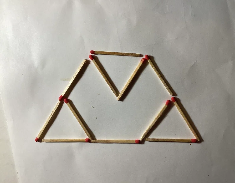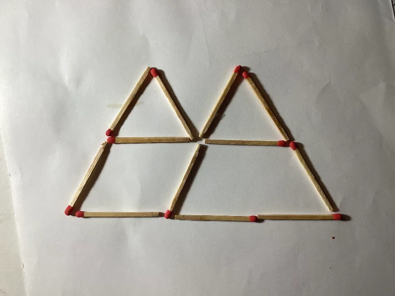 This puzzle is adapted from 100 Geometric Games by Pierre Berloquin. Twelve matches are arranged as in the image. Can you change the position of four matches to exactly form three equilateral triangles? Do not remove any of the matches.