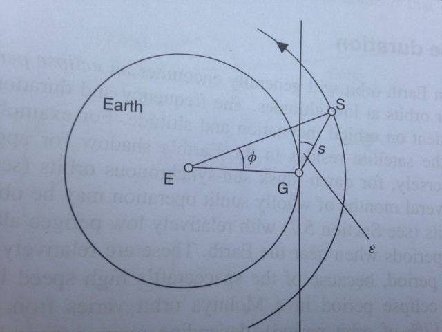 I've extended the line from the centre of the Earth, through G, and out through the orbit path of the satellite. Now, I've drawn a vertical down from the satellite S parallel with the existing straight line until it intersects that extended line. I've called ##r## the height above the Earth of this point where my additional lines intersect.