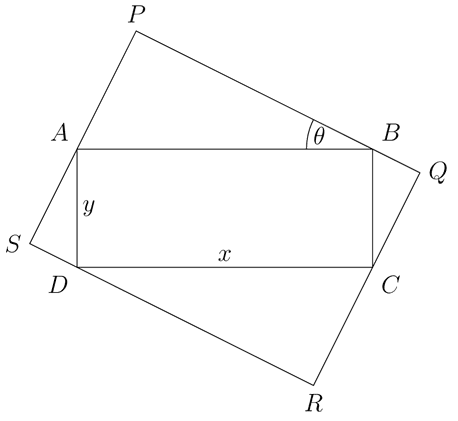 The discussion focuses on determining the possible values of the area \( A \) of a rectangle circumscribing another rectangle with sides \( x \) and \( y \). The area \( A^2 \) is expressed as \( A^2 = (x\cos\theta + y\sin\theta)(x\sin\theta + y\cos\theta) \), leading to the conclusion that \( A \) ranges from \( \sqrt{xy} \) to \( \frac{1}{\sqrt{2}}(x+y) \) as \( \theta \) varies between \( 0 \) and \( \frac{\pi}{2} \). The minimum area occurs at \( \theta = 0 \) or \( \frac{\pi}{2} \), while the maximum area occurs at \( \theta = \frac{\pi}{4} \).