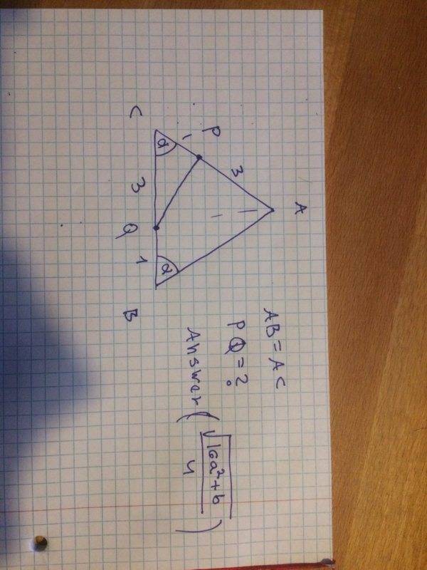 The discussion revolves around a geometry problem involving an isosceles triangle where points P and Q are defined on the sides AC and CB, respectively. Participants explore methods to find the length of segment PQ, considering various approaches including the cosine theorem and Pythagorean theorem, while debating the necessity of using cosine law versus purely geometric methods.