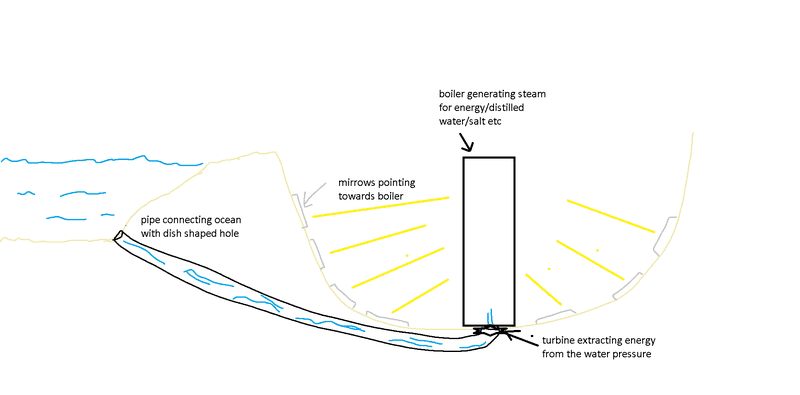 Then we would dig a huge area on land, again, as deep as possible. Lead the pipe to the lowest level of this huge basin we created and then use the pressurized water coming out to generate energy.