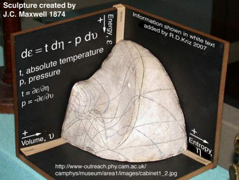 A few weeks ago I found http://www.sv.vt.edu/classes/ESM4714/methods/Gibbs.html" by Dr. Kriz of Virginia Tech. He describes how Gibbs envisioned a 3D U-S-V (energy-entropy-volume) surface, from which Maxwell created a sculpture.