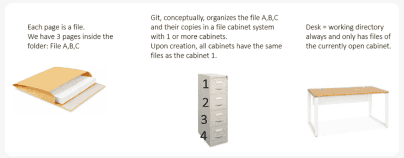 - At the very beginning, we open cabinet 1 (branch 1). All other cabinets/branches are closed. We have files A and B inside cabinet 1. These two files will be placed by Git (clerk) on our desk (working directory).