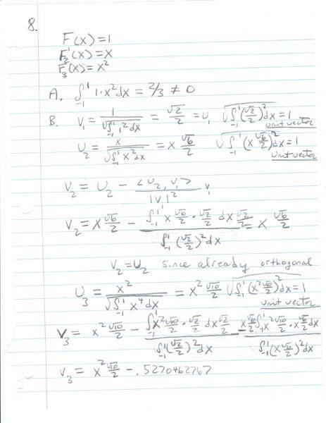 The problem involves finding an orthonormal basis for the functions 1, x, and x^2 over the interval from -1 to 1, utilizing the Gram-Schmidt process.