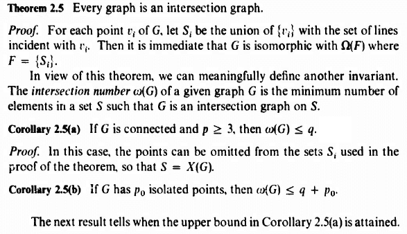 The discussion focuses on the intersection number in graph theory, specifically addressing when it is less than the number of edges. Participants seek clarification on whether a subset Si of a set S includes a vertex v_i along with its incident edges. The consensus indicates that Si indeed contains both the vertex and the associated edges, confirming the relationship between vertices and edges in subsets.