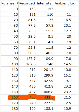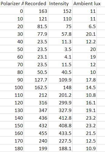 The first column is the polarizer angle measured in degrees.