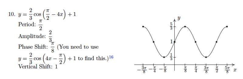 In all of the following examples the task is to find the period, amplitude, phase shift and vertical shift, and graph at least on cycle. I am making the accent only on x values, as it is easy to compute y values, and there are no problems with those. I would like to understand the pattern for choosing x values.