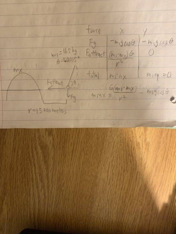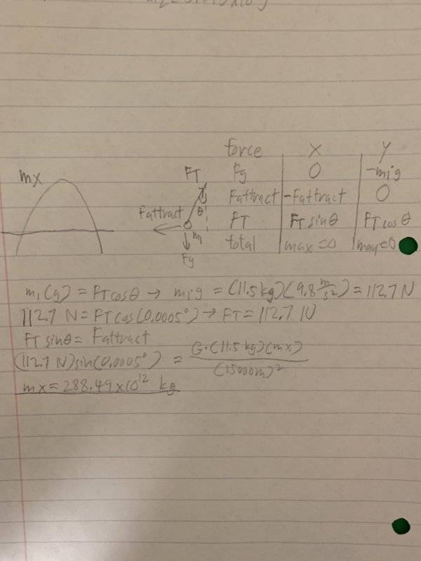 When they are still a distance 15000 meters away from the mountain, they make a local gravitational force measurement: they hang a ball of mass 11.5 kg from a string. The string doesn't hang vertically, but tilts very slightly towards the mountain. Dixon estimates the angle to be 0.00050 degrees.