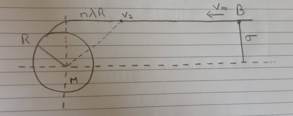 So, my approach is when object is at a distance ## r= \sigma \sqrt{n^2 + 1} ##, its velocity is ## v_2 ##.This velocity should be less than the orbital velocity at distance ## r ## for it to collide with planet A.