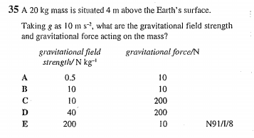 Am I wrong when I say that because the height of the mass ( which is 4m) is too little comparing with the radius of the Earth so that the gravitational field strength is equal to the free fall acceleration? My answer key said that not 10 but 40 is the right answer. Can anybody explain to me why the answer is 40?