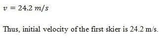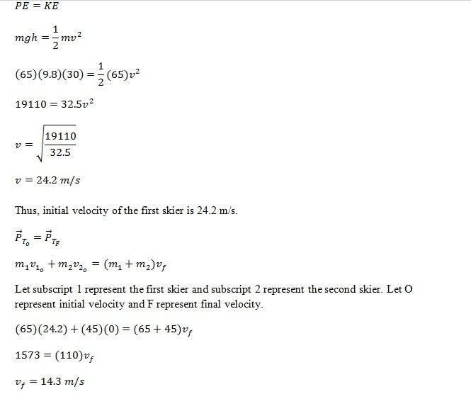 The problem involves a 65 kg skier sliding down a 30 m high hill and colliding with a stationary 45 kg skier in a completely inelastic collision. The objective is to find the final velocity of both skiers after the collision.