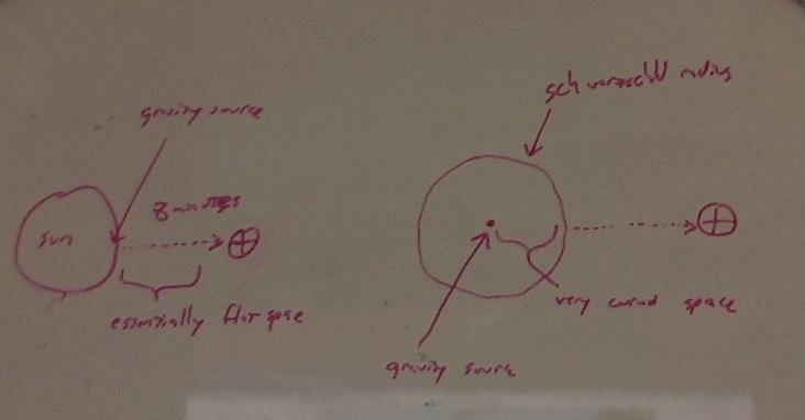 - One participant points out that the gravity experienced at a given event is influenced by sources in the past light cone, which raises questions about gravity's behavior in relation to black holes.