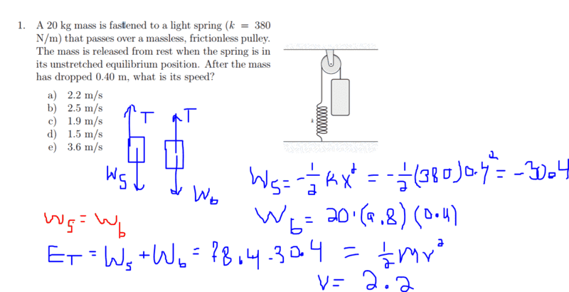 The discussion revolves around a problem involving gravity, springs, and kinetic energy, focusing on the relationships between work, energy, and forces in a mechanical system.