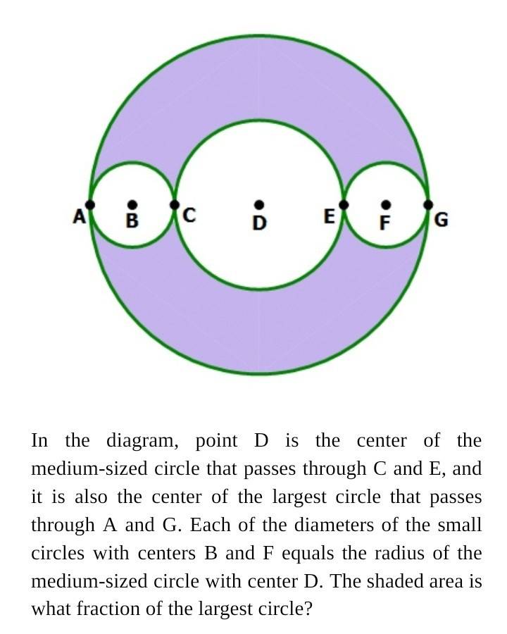 The discussion revolves around a GRE geometry problem involving the calculation of the shaded area formed by three circles of different sizes. Participants explore methods to express the area as a fraction, considering the relationships between the radii of the circles.