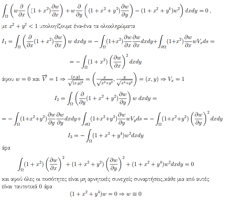 Prove using Green's theorem that the boundary value problem $$\frac{\partial}{\partial{x}}\left ( (1+x^2)\frac{\partial{u}}{\partial{x}}\right )+\frac{\partial}{\partial{y}}\left ( (1+x^2+y^2)\frac{\partial{u}}{\partial{y}}\right ) -(1+x^2+y^4)u=f(x,y), x^2+y^2<1 \\ u(x, y)=g(x,y), x^2+y^2=1$$ has at most one solution.