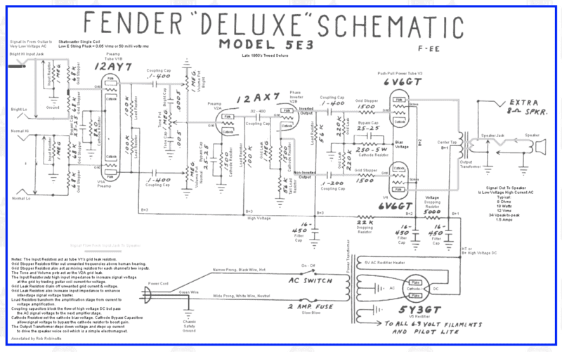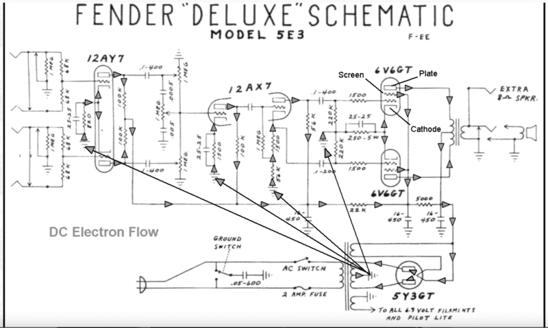 If you do not know, the electric guitar signal that comes from the guitar pickups, is in fact an "AC" signal that flows into the pre-amp tube grid which disrupts the flow of electrons flying off the cathode moving toward the anode plate. The signal is "gained up" in the first and second stages of the dual triode preamp tubes. So: the amp operates on DC power, but it processes an AC guitar signal all the way through the circuit.