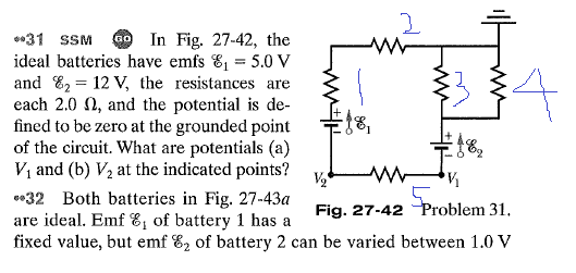 1.i found a solution using kirchhoff law, V1=-11V,V2=-9V