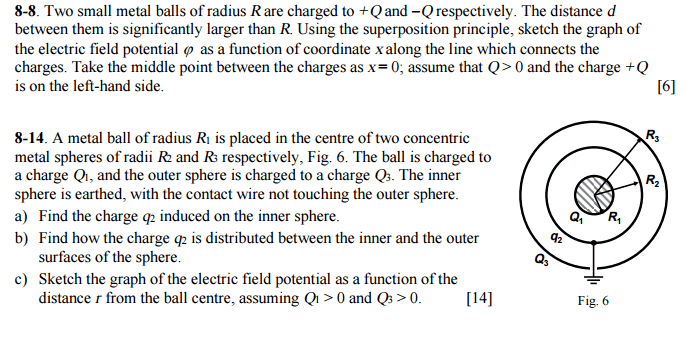 This discussion focuses on solving electrostatics problems involving grounded conductors and electric field potentials, specifically problems 8-8 and 8-14. The key equations utilized include the potential formula V = kq/r, where k is the Coulomb's constant. The discussion emphasizes the importance of charge distribution on spherical shells and the superposition principle for calculating potentials. Participants clarify the relationships between charge densities σ1, σ2, σ3, σ4, and σ5, and how to derive them from the given conditions.