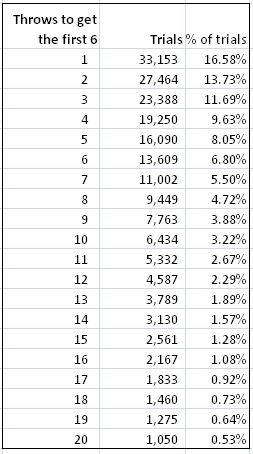 The table below shows the probabilities for getting a 6 in up to 20 throws.